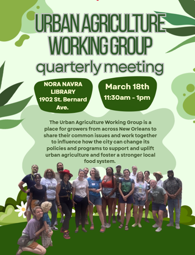 Join us at Nora Navra Library on Wednesday, March 18th at 11:30am for a meeting of urban farmers, community gardeners, and food policy advocates to hear updates on the City's Urban Agriculture Program and provide input. We'll be joined by NORA to discuss their Growing Green program and will also spend time discussing the early phases of the Urban Agriculture & Food Access Plan. Email urbanag@nola.gov with any questions.