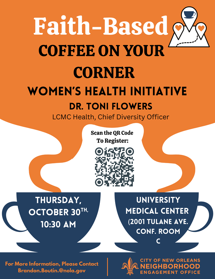 The Faith-Based initiative is designed to connect leaders of faith to City departments, opportunities, and resources to address community needs. This initiative was created to strengthen the relationship between the City of New Orleans and its Faith leaders. Through a series of events, coordinated by our office, such as Faith-Based Community Office Hours, Coffee on Your Corner, and Luncheons, Faith leaders are able to convene, network, and receive information to share with their congregations. In order to continue to nurture and cultivate a meaningful and thoughtful relationship with all leaders of faith in our City, the Faith-Based Coordinator in our office continues to make himself available at our events during the week in the morning and evening.