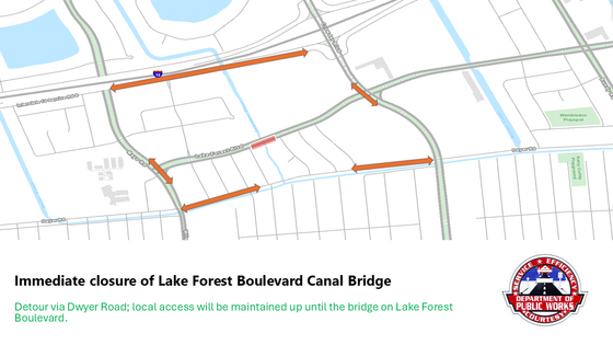 New Orleans--The City of New Orleans announces the immediate closure of the eastbound portion of the Lake Forest Boulevard Canal Bridge. This closure will remain in effect until further notice.