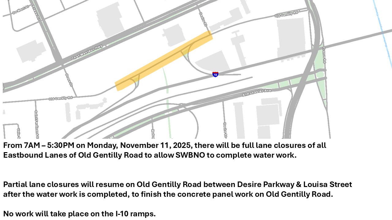 NEW ORLEANS — The City of New Orleans Department of Public Works (DPW) announces that starting Monday, Nov. 11 at 7 a.m., there will be full lane closures to all through traffic in Eastbound lanes of Old Gentilly Road, within the current construction footprint running from Louisa Street to Desire Parkway. These full lane closures are expected to last from 7 a.m.– 5:30 p.m. to allow SWBNO to complete waterline repairs. These waterline repairs are needed to complete the concrete panel replacements already underway. After SWBNO water work is completed, traffic will resume the construction traffic pattern that was in place to complete the roadway work.